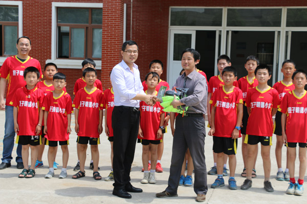 6月5日上午,桃園仙居房產(chǎn)公司周經(jīng)理一行三人攜帶買好的38套足球服和18副足球護具,來到擔子明德小學,將這些足球用品贈送給學校足球隊隊員們。這是該公司得知擔子明德小學成立足球隊后對學校和隊員們伸出的援手,旨在校企聯(lián)合,共同發(fā)展校園足球。